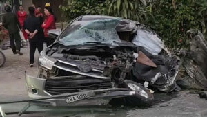Sau va chạm với xe tải trên quốc lộ 21, đoạn qua xã An Nghĩa, tỉnh Phú Thọ, xe con bẹp dúm, may mắn không...